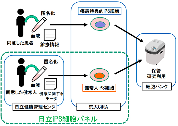 疾患特異的iPS細胞パネルは,CiRAが特定の疾患を持つ患者さんから検体や診療情報の提供を受けて構築しているが,今回,日立が運営する日立健康管理センタは,健康診断に訪れる健常人からドナーとなるボランティア(以下,ドナー)を募り,CiRAにおける日立の健常人iPS細胞パネル(以下,日立iPS細胞パネル)の構築に協力する。