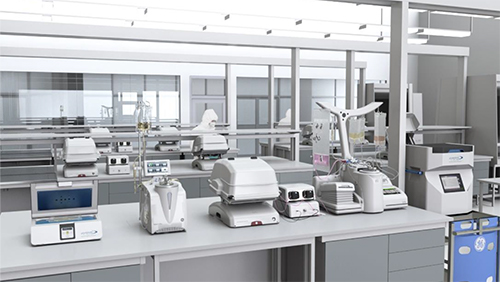 再生医療向け製造施設“FlexFactory™ for Cell Therapy”のイメージ(導入製品例。左から:小型細胞融解システムVIA Thaw CB1000,閉鎖系自動細胞調製システム(最大880ml) Sepax™ C-Pro Cell Processing System,閉鎖系自動細胞培養システム(最大5L)Xuri Cell Expansion System W25,閉鎖系自動細胞調製システム(最大10L) Sefia™ S-2000 Cell Processing instrument,小型細胞凍結プログラムフリーザー VIA Freeze Quad。その他,単核細胞分離用試薬や,T細胞大量培養向けインターロイキン,培地,血清,バッファー等の試薬製品も提供。)