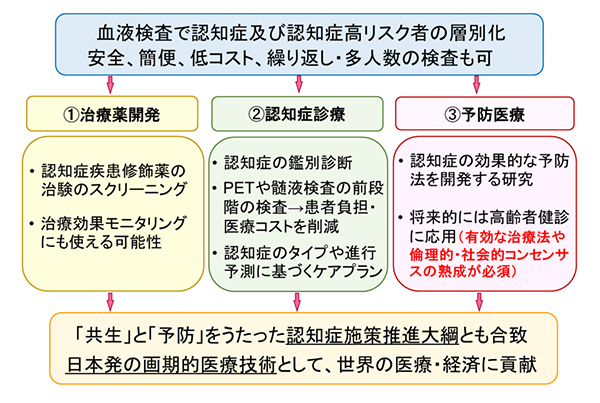 3.予防医療:これまでに認知症の効果的な予防法を開発する研究は盛んに行われてきたが,大規模集団をバイオマーカーで層別化することは現実的に不可能だったため,脳の背景病理や病態と照らし合わせて介入効果を詳細に評価することができなかった。血液検査によって層別化が可能となれば,認知症の効果的な予防法を開発するための研究を促進する大きな原動力となると考えられる。また,将来的には高齢者健診に応用することにより,認知症高リスク者に対する早期介入やリスク管理,生活習慣の改善等による発症予防に役立てることができれば,高齢者の健康寿命の延長に寄与し,認知症対策コストの低減にも繋がると期待される。