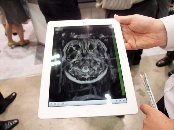 HOPE製品では,電子カルテシステム「HOPE/EGMAIN-GX」にモバイル機能が搭載された新バージョンが出品された。iOS端末とAndroid端末上で,専用アプリケーションを用いて,カルテやPACS画像などを参照できる。これにより,患者ベッドサイドや外出先からでも容易に情報にアクセスすることが可能となる。