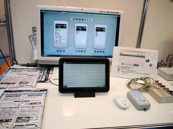 このうち,「東京大学社会連携講座によるモバイルICT活用事例」では,東京大学大学院医学系研究科健康空間情報学講座やNTTドコモによる「モバイル・クラウド12誘導心電図」などを展示した。これは,救急医療において,病院到着前に12誘導心電図を測定しデータを伝送することで,心疾患の診断・治療を支援するもの。北里大学病院や北斗病院で実証実験を行っている。ほかにも「ICTを利用した2型糖尿病管理システム“DialBetics”」などのデモンストレーションが行われた。