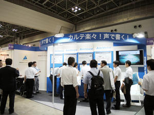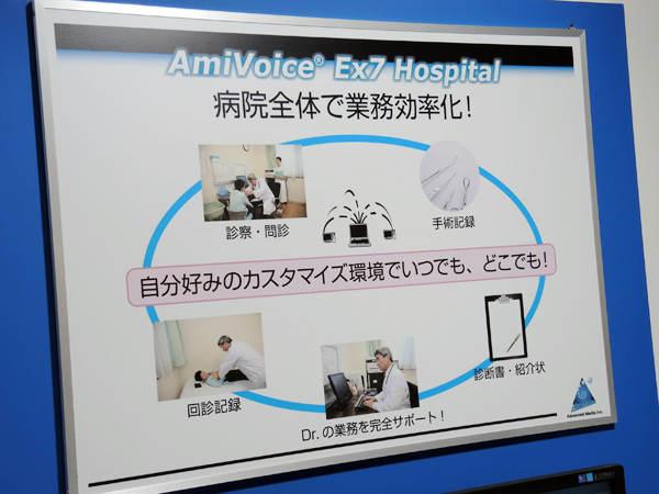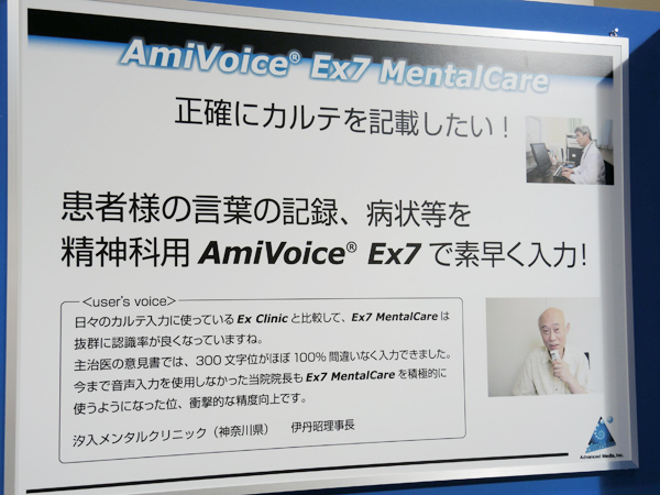 医療分野での音声入力システムとしては圧倒的なシェアを持つアドバンスト・メディア では,「AmiVoice EX7」のラインナップなどを出展し,実際の音声入力を来場者が体験できるデモを行った。