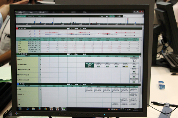 また,ITEM2013で参考展示され,7月11日にリリースされたばかりの新製品である臨床支援ビューイングシステム「CA-V(シーエーブイ)」が紹介された。CA-Vは,電子カルテや部門システムのデータを取り込み,参照できるようにする仕組みはClinical Portal PLUSと同様だが,医師の意思決定をより専門的に支援できるように設計されているのが特長だ。CA-Vでは,患者別・疾患別にデータを取り出し,患者の病態の変化を時系列に沿って一覧表示する。表示方法は,診療情報を時系列にグラフで表す“タイムラインビュー(TLV)”と,診療情報の全項目の数値データを表形式で表示する“タイムスライスビュー(TSV)”が可能だ。TLVでは,“疾患別絞り込み表示機能”によって,主要40疾患を対象にある疾患に必要な項目に絞り込んだ表示が可能で,処方内容やそれによる検査値の変化などを一覧で把握でき,医師の診療方針の決定をサポートする。