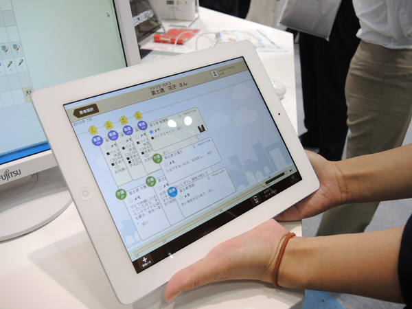 富士通 は,メインステージにおいて「地域医療ネットワークの拡充へ」と「医療に役立つ情報を収集,蓄積,活用する時代へ」という2つのテーマでプレゼンテーションを行った。その内容は,同社の医療情報システムの開発の歴史を振り返った上で,「地域医療ネットワークの拡充へ」として,「HOPE/地域連携」や「HumanBridge」といったこれまでの地域医療ネットワークシステムを紹介。その上で,医介連携や在宅診療の充実化を図るための新製品として,タブレットを用いて多職種連携を促進する「HumanBrigde EHRソリューション在宅ケアSNS(仮称)」をPRした。