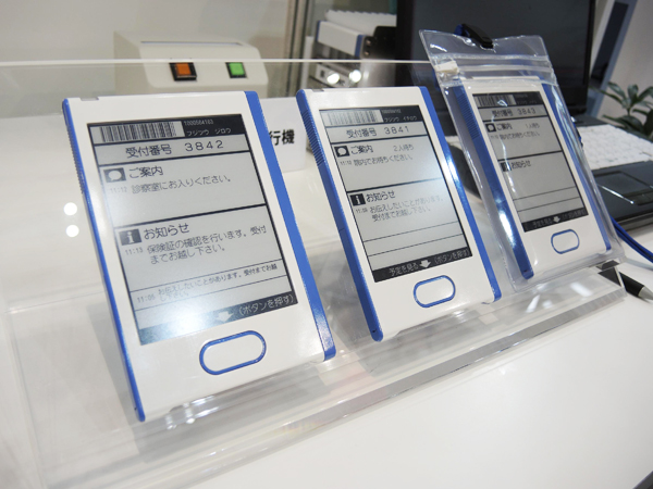 患者サービス向けのソリューションとしては,患者案内カード「NAVIT」が新たな電子ペーパーを採用し,第二世代へと移行した。NAVITは外来患者が携帯し,診察待ちの状況などを案内するもので,患者サービスだけでなく,病院側にとっても患者を捜す手間や呼び出し業務を省力化できる。通信には独自のプロトコールである「FBStar」を採用し,多数の患者に個別に情報を発信する。電子ペーパーは,週1回の充電で良いなど,低コストで運用できるのもメリットである。