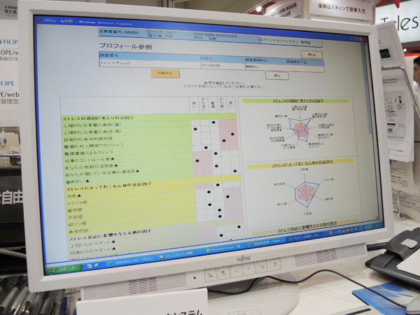 企業向けには,健康診断支援システム「HOPE webH@ins-GX」のオプションや単体としても提供する予定の「富士通ストレスチェックシステム(仮称)」のデモを行った。これは従業員がストレスの状況をシステム上に入力することで,自ら確認ができるほか,企業側が集められたデータを基に組織内でのストレスの状態を把握できるというシステムである。