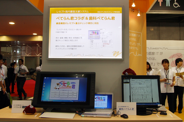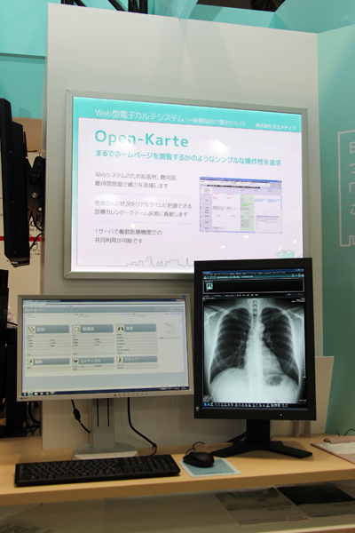 電子カルテシステムでは,100床程度の規模の医療機関向けのWeb型システム「Open-Karte」(日立メディコ)を展示。Webベースのシステムのため,専用ソフトウエアは不要で,柔軟で低コストな拡張が可能となっている。診療カレンダーも特長のひとつで,時間軸で患者の診療状況を視覚的に把握することができる。