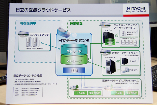 なお,日立では現在,電子カルテと医事会計データを預かる医療クラウドサービスを提供しているが,将来的にはデータバックアップ/アーカイブサービスや,地域医療連携のための医療データサービスプラットフォームの提供を予定しているという。