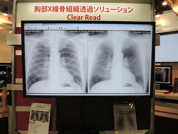 胸部X線骨組織透過ソリューション「Clear Read」は,X線画像上の骨組織を透過処理を行い見えなくすることで,胸部の視認性を高める技術。画質改善処理も同時に行う。X線装置に依存せず,骨組織を透過させることができる。新たに過去画像の骨組織も透過させて,比較表示することも可能になった。