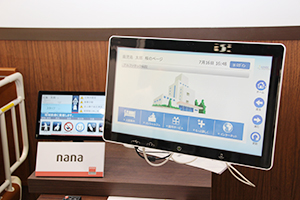 バルコは,全面フラットディスプレイ「nana」とアルファテック・ソリューションズのベッドサイド情報システムを組み合わせたベッドサイドソリューションを展示した。患者は1つの端末でテレビやインターネット,病院からの案内情報などのサービスを受けることができる。電子カルテとの連携により患者情報を閲覧できるとともに,医療看護師支援ピクトグラムも搭載し,医療安全の向上に貢献する。