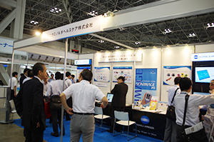 コニカミノルタヘルスケアは,在宅医療向けのソリューションとして,ワイヤレスFPDの「AeroDR」を用いたモバイルシステムを紹介したほか,手のひらサイズの超音波診断装置「SONIMAGE P3」,訪問先でiPadから電子カルテシステムに入力する「Unitea α CIS」などを展示した。