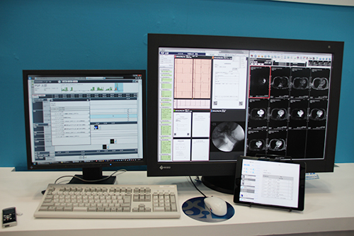統合検査情報システム“Portal Space Ace”。1つのモニタに複数のウインドウで表示することもできるが,複数のモニタを使用しての展示を行っていた(左:ポータル画面,右:専用ビューワ,タブレット端末:処方情報)。