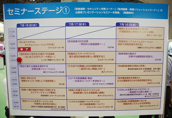 国際モダンホスピタルショウ会場内に設けられたセミナーステージでは,出展企業各社のプレゼンテーションが行われた。ステージ(1)では,「医療連携・セキュリティ対策コーナー」「医用画像・映像ソリューションコーナー」の出展者19社が参加した。
