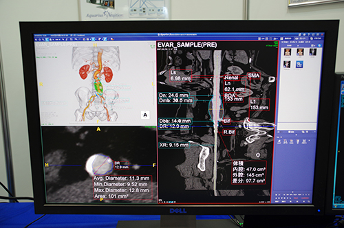同社は,出展者プレゼンテーションセミナーも行った。7月16日(水)に行われたこのセミナーでは,聖隷浜松病院事務局長の日下部行宏氏が,「聖隷浜松病院での電子カルテ全館3D解析利用連携における業務の効率化と治療寄与効果」をテーマに講演した。日下部氏は,同院が構築した電子カルテシステム端末から同社製の参照用ビューワを起動できるようにして,手術室や外来などで3D画像を見られるようにした環境について説明。業務効率と診療の質の向上につながっていることを紹介した。