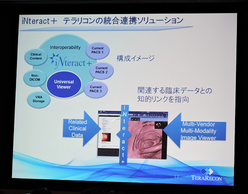 テラリコン・インコーポレイテッドは,病院全体でCTやMRIの3D画像を参照するための環境を提案した。「iNtuition REVIEW」は,3Dワークステーションとしての豊富な画像処理機能に加えて,PACSビューワとしての機能も併せ持つ。異なるモダリティ画像の自動位置合わせや過去画像比較,3D画像と2D画像の並列表示が可能。マンモグラフィのトモシンセシスにも対応している。また,「iNtuition EMV」は,Webベースにビューワで,電子カルテシステム端末に相乗りして3D画像やDICOM画像に加え,内視鏡画像,病理画像を参照用に表示する。
