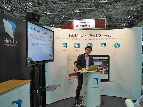 ファイルメーカーは,FileMakerプラットフォームで開発を行っているシステムベンダー(FileMaker Business Alliance:FBA)のソリューションの紹介を中心に,好評のFileMakerに関する相談コーナーの“FileMaker Bar”や,最新バージョンFileMaker 17や各FBAのソリューションの内容を紹介するプレゼンテーションコーナーなどでブースを構成した。また,2017年からサービスがスタートしたFileMaker Cloudについて,7月11日にリリースがあった大阪医療センターの導入事例をビデオで紹介した。