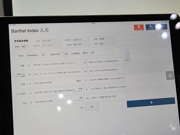 ジェネコムは,Barthel IndexやFIM(Functional Independence Measure)の入力やデータ管理が可能な「機能評価システム」,多言語に対応した「問診票システム」などを紹介した。BIもFIMも日常生活動作(ADL)を評価するための基準で,Barthel Indexは10項目,FIMは18項目で評価する。これまではExcelなどで集計することが多かったが,FileMakerプラットフォームを利用し,FileMaker GoとiPadによってタップによる簡単な入力,iPadのカメラを使ったビデオ撮影など,情報のインプットがより簡単になる。これによって,入所当初からの状態を経時的に確認できるようになり,リハビリの効果判定などを支援する。