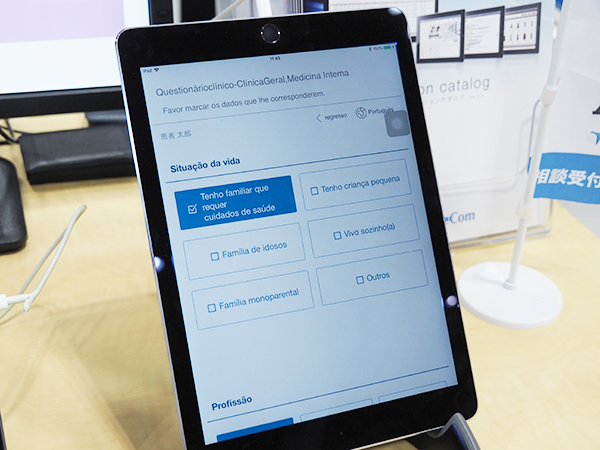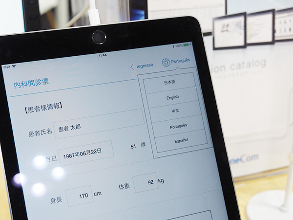 問診票システムは,iPadを使って問診票を入力するものだが,日本語,英語,中文,ポルトガル語,スペイン語の5カ国語に対応する。項目は同じため,相手にあわせて言語を変更し入力してもらい,それを日本語で表示すれば日本人スタッフが簡単に内容を確認できる。訪日外国人の増加に伴い,医療機関でも外国語対応が必要なケースが増えているが,自動翻訳や通訳など本格的な対応が難しい小規模施設でも簡単に導入できるソリューションとなっている。