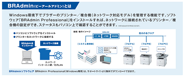 院内のさまざまな場所に設置されるプリンタに対して「稼働状況を一目でわかるようにしたい」と言うお悩みをよく聞きます。それを実現するのが,ブラザーのプリンタ管理ツール「BRAdmin」。各機器の印刷枚数はもちろん,インク切れなども一目で分かるようになるので,トラブル発生時に迅速な初動対応が可能です。