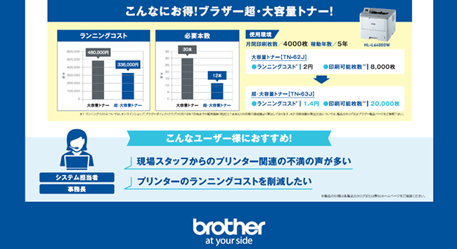 プリンターの展示では,A4モノクロレーザープリンターのハイエンドモデル「HL-L6400DW」のランニングコスト低減が可能になったことをアピールした。レーザープリンターの消耗品は汎用品が使われることも多いが,印字トラブルや故障の原因にもなる。そこで,2019年6月から提供を開始した純正の超・大容量トナーを使用することで,コストを抑えて,トラブルリスクを低減する運用を提案した。超・大容量トナーにより,1枚1.4円,印刷可能枚数が2万枚となり,ランニングコストの約30%カット,トナー交換頻度の低減(従来の半分以下)が可能になる。