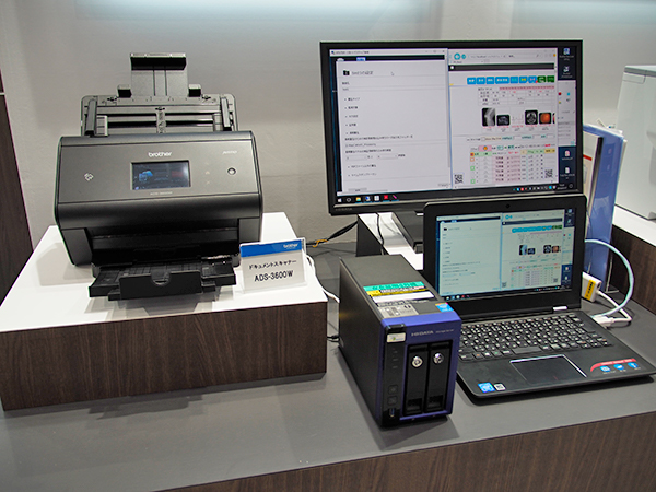 ドキュメントスキャナー「ADS-3600W」(左)をはじめとした効率的な電子化ソリューションを提案