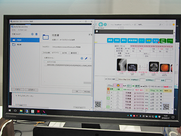 スキャナーのコーナーでは,ドキュメントスキャナー「ADS-3600W」を展示し,紙カルテや紹介状などの効率的な電子化を紹介した。ソフトウエア「バーコードユーティリティ」により,バーコードやQRコードをキーとして,1)一度にスキャンしたデータを分割,2)あらかじめ指定した任意のファイル名で保存,3)指定したフォルダに格納という,書類の電子化に伴う一連の作業を自動で実行することができる。省力化だけでなく,ミスの少ない電子化が可能になる。