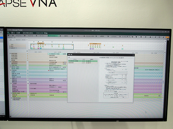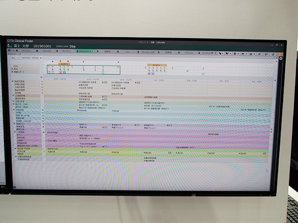 今回の共同出展の目玉となったのが,統合診療支援プラットフォーム「CITA Clinical Finder」(以下,CITA)に,富士ゼロックスの「Apeos PEMaster ProRecord Medical」(以下,ProRecord)の機能が統合されたことだ。2018年の国際モダンホスピタルショウでも,両システムの連携機能が紹介されたが,最新バージョンのCITAでは,ProRecordのツリービュー,マトリックスビュー,仮想プリンタ,チェックマーク解析の機能を搭載し,診療録を電子化し原本として管理,運用する機能が強化された。ProRecordは,大阪大学医学部附属病院が提唱した“DACS(Document Archiving and Communication System)”のコンセプトに基づいた製品で,院内で発生する情報をドキュメント(PDF,XMLなど)を中心に管理するソリューションである。CITAにはライムラインビューやレイアウトビューなど,診療情報を集約して表示することで診断や治療をサポートする機能があるが,ProRecordのDACSのコンセプトに基づいた文書管理の機能を追加することで,電子化を前提とした医療機関の情報管理をトータルでサポートすることが可能になった。ブース内のプレゼンテーションステージでは,CITA Clinical Finderを活用する慈恵医科大学附属病院,佐賀県医療センター好生館の事例などが紹介された。