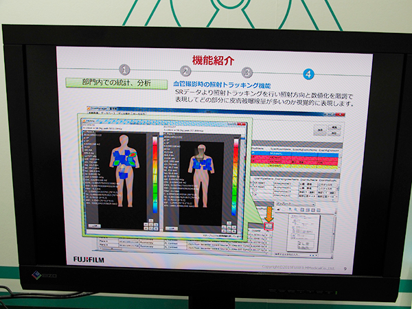 2020年4月からの義務化に伴い注目を集めている被ばく線量管理システムとして「DOSE MANAGER」を展示した。DOSE MANAGERでは,単なる被ばく線量管理にとどまらず,各モダリティから収集した線量情報を統合し,放射線影響度を推定する係数処理を行うことで,患者ごとの被ばく線量情報としてデータベース化できる。また,PACSやRISと接続して蓄積されたデータが二次利用でき,RISで入力された基本情報や実施情報などを利用したり,PACS側に画像と共に線量管理データを送信したりといった活用が可能になる。さらに,放射線科内だけのデータの管理や活用だけでなく,院内でも利用できるように線量管理のレポート機能が強化されており,CITAを使うことでほかのレポートや検査データと同様に統合管理が可能になっている。