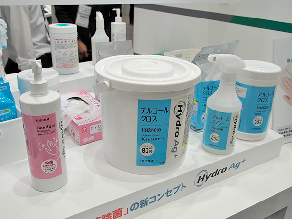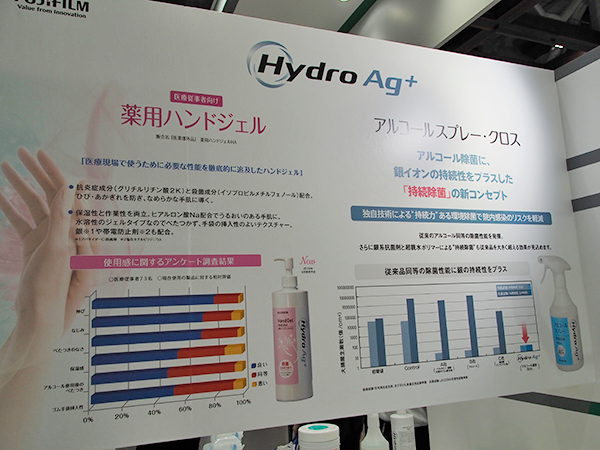 “Hydro Ag⁺”は,富士フイルムのフィルム技術を生かして開発された抗菌技術で,銀系抗菌剤と超親水ポリマーを組み合わせて,除菌効果を持続させることができる。ブースでは,アルコール除菌にHydro Ag⁺をプラスして“持続除菌”が可能な「アルコールスプレー・クロス」や,Hydro Ag⁺を配合した「薬用ハンドジェル」(医療従事者向け)などを紹介した。殺菌効果と同時に手荒れなどを防ぐ薬用ハンドジェルは,2019年9月発売予定。