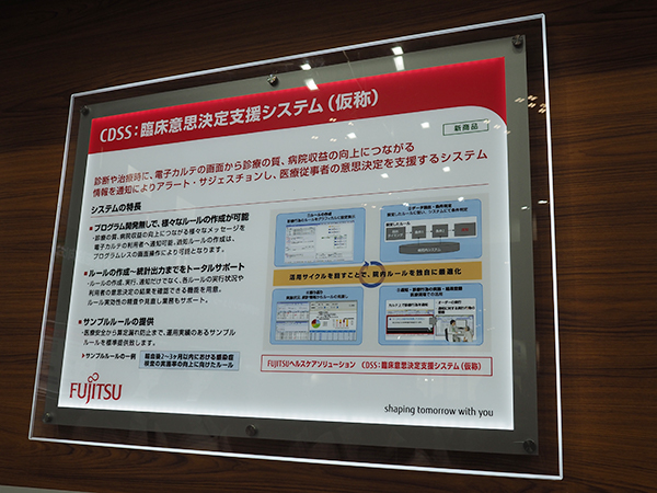 富士通は,南展示棟4階の南3,4ホールに出展した。今回の展示に関しては,中小規模病院や診療所向けの電子カルテや,介護システムを中心に構成し,「HOPE LifeMark-MX」や「HOPE Cloud Chart」,「HOPE LifeMark-SX」,介護事業者支援システム「HOPE LifeMark-WINCARE」などを展示した。また,最先端技術で医療機関の働き方改革をサポートするソリューションとして,AIを活用した会議発言録作成支援システム「Talk Visible」や臨床意思決定支援システム「CDSS」(仮称)の参考展示など,豊富な実績を土台に進める未来を見据えたソリューション開発の成果がピーアールされた。