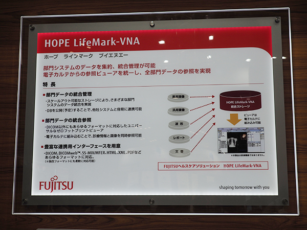 院内データの統合管理・参照システム「HOPE LifeMark-VNA」は,部門システムの画像やレポート,文書データを“統合ストレージ”に集約,統合し,DICOMやSS-MIX/MFER,HTML,PDFなどあらゆるフォーマットに対応した“ユニバーサルビューア”で,検査結果や経過などと並べて参照できる。ユニバーサルビューアは豊富なレイアウト設定が可能で,病院共通用と個人用で各100パターンが登録できる。富士通のストレージ技術“FUJITSU Storage ETERNUS”の採用で,ストレージの有効利用や安定したパフォーマンスの提供など,ストレージシステムを取り巻くさまざまな課題を解決する。