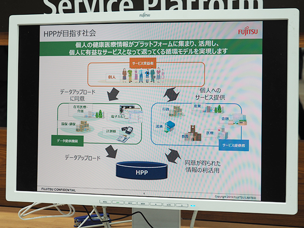 「Healthcare Personal service Platform(HPP)」は,個人の健康医療情報を取り扱う各種アプリケーションの開発からサービス提供までを統合的にサポートする情報基盤サービス。HPPでは,富士通の持つ個人の同意管理の仕組みや3省3ガイドラインに対応したセキュリティの高いインフラを利用して,企業や自治体の豊かで健康的な生活を支える付加価値の高いサービスの開発をサポートする。現在,約20団体・サービスが運用中で,富士通が取り組む「共創」の一環として,今後も拡大をめざしていく。