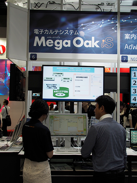 “医療安全と業務効率化の両立”で展示された電子カルテシステム「MegaOak/iS」は,“医療従事者の目線に寄り添い,思いを伝える”をコンセプトに開発された。大規模病院向けのシステムとして着実に導入実績を伸ばしている。システムとしては,安全で確実な業務を支援するために視認性の向上などユーザーインターフェイスの工夫や機能の向上を図っている。ブースでは,“KeyValue”や“クリニカルデスクトップ”などMegaOak/iSの特徴的な機能を中心に来場者に説明した。また,“ヒストリーマップ”では部門を含めた診療情報の一括管理が可能で,電子カルテを中心とした病院情報の統合管理が可能になることをアピールした。