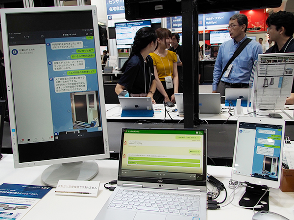 “働き方改革×ICT”では,NECの持つさまざまな最新技術を医療やヘルスケア領域に応用した事例も紹介された。AIチャットボット「NEC 自動応答」は,従来は電話やメールで行われていた問い合わせの対応をWebやLINEなどのSNS,音声などで自動回答するシステムだ。実際に,救急相談にチャットボットを利用した「埼玉県AI救急相談」が,2019年4月からの試行導入を経て,7月から本格稼働している。ブースでは,院内でのME機器の予約,貸し出しのやりとりにAIチャットボットを使って業務の効率化を図るシステムを紹介し,来場者の注目を集めていた。