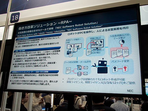 また,近年,PCで行う作業や操作をソフトウエアロボットに記憶させて業務を自動化するRPA(Robotic Process Automation)が注目されている。「NEC Software Robot Solution」は,アイコンから選択し実際のPC操作を行うだけで業務の自動化ができるのがポイントだ。ブースでは,電子カルテシステムで特定のキーワードで検索し,該当した患者に同じテキストを入力するという業務を自動化する様子などを紹介した。