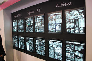 MRIでは,フルデジタルテクノロジーdStreamを搭載し,最大40%のSNRの向上とチャンネルフリーによるワークフローの改善を実現した「Ingenia 3.0T」を展示した。Ingeniaでは,アナログデジタル変換器をワンチップ化してコイルに内蔵し,アナログケーブルによる信号ロスをなくしてSNRの向上を図ったほか,チャンネルの概念がなくなったことで,デジタルコイルのバリエーションが増え,高画質の検査が可能になった。ITEMでは今回初めての展示となるが,すでに日本では20施設以上に導入されており,MRIコーナーでは日本の医療機関で撮影された臨床画像をフィルムに出力して展示,ユーザーが見慣れた条件でIngeniaの高画質を実感できるように工夫されていた。通常は横断像で撮像するDWIを矢状断で撮像することで,短時間で高画質の画像が得られるDirect Coronal DWIの画像などに注目が集まっていた。さらに,MultiTransmit4Dによる3Tの心臓MRI検査,非造影Perfusion ASL,非造影MRAなどの新しいアプリケーションをアピールした。