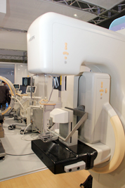 マンモグラフィのコーナーでは,「MammoDiagnost DR」の新しいユニットとしてステレオバイオプシー対応ガイダンスツール「StereoGuide」を展示した。StereoGuideは,検診用マンモ装置に簡単に取り付けられるステレオバイオプシー用のユニットで,精検にも対応できることで,MammoDiagnost DRの用途を広げるユニットである。