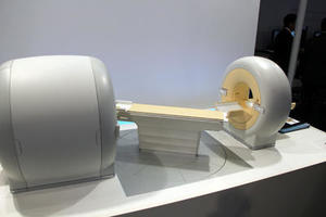 「Ingenuity TF PET/MR」は,フィリップスが2010年のRSNAで初めて発表したPET装置とMRIを組み合わせた複合機である。2011年にCE,FDAを取得し全世界での臨床稼働が始まっていたが,日本でもこのほど薬事承認を受け販売を開始した。今回はミニチュアモックアップによる展示だったが,Time of Flight(TOF)が可能なPETと3T MRI(Achieva)の間のベッドが回転して,PETとMRIの画像が収集できることを再現していた。装置の特長としては,TOFによる高精度のPET画像が得られること,MRIではMultiTransmit技術の高画質と豊富な受信コイルをそのまま使用できることが挙げられる。PET側ではMRIの磁場の影響を防ぐため,シールドなどの対応を行っている。展示では,IntelliSpace Portalによる全身のがんのスクリーニングや前立腺がんのフュージョン画像などが紹介されていたが,臨床的な有用性としては小児領域や脳神経領域のパーキンソン病やアルツハイマーの診断への適応が期待されるとのことだ。