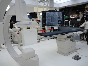 一方,血管撮影装置は,「Infinix Celeve-i INFX-8000C」を展示した。画面の分割表示などレイアウト変更が可能な56インチ型の大型液晶モニタを採用しており,経カテーテル大動脈弁置換術(TAVR)などを施行するためのハイブリッド手術室に対応した専用寝台を組み合わせている。天井走行式Cアームによる広範囲の横手・長手移動で,安全かつ正確な手技を支援する。