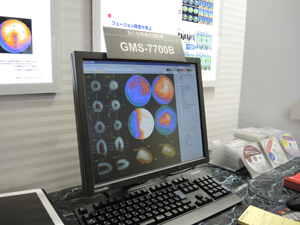 核医学装置のコーナーでは,SPECT「Symbia E」と組み合わせる独立型画像処理装置「GMS-7700B」を中心にPRを行った。東芝独自の再構成技術を搭載し,TEW法散乱線補正やサイノグラム輪郭抽出,Iterative Chang法減弱補正により定量性の高い画像を提供する。また,心筋SPECT検査での減弱によるアーチファクトの影響を抑えるSSPAC法は,γ線の情報から画像処理を行うため,外部線源やCTが不要で,被ばくを低減し,投資コストや検査時間を抑えるというメリットをもたらす。また,開発中の3検出器型ガンマカメラが薬事未承認品として参考展示されていた。
