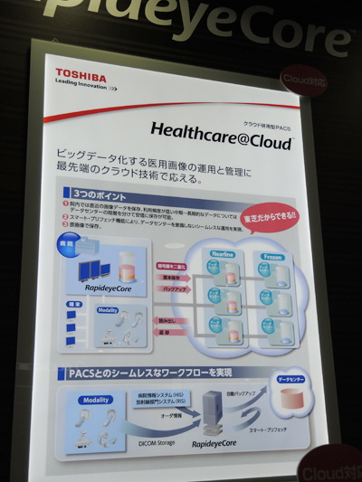 ヘルスケアIT関連では,PACS「RapideyeCore」に対応するクラウドサービス「Healthcare@Cloud」などが紹介された。「Healthcare@Cloud」は,「RapideyeCore」のデータのうち,中・長期保存の過去データをそれぞれ「Nearline」と「Frozen」という階層に分けて,データセンターに保存。直近の画像だけを院内に保存することにより,低コストで安全にデータを管理できる。スマート・プリフェッチ機能により,院内で画像を保存しているような,シームレスなデータ運用を実現している。さらに,「Healthcare@Cloud」を用いて,夜間や休日などの,放射線科医が不在の際に,遠隔地にいる放射線科医がタブレットなどを用いて画像を参照するといったことが可能になる。