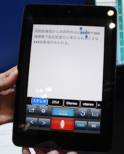 タブレット用のソフトウエアでは,iOS対応のアプリケーションとしてAmiVoice Smartが出品された。これは外出中など,遠隔で画像を参照した時などに,簡単なレポートを音声で入力するためのソフトウエア。アプリケーション本体に辞書を組み込むため,AmiVoice Ex7 Radと同等の認識率を持つ。認識したものは指定の端末にWi-Fi経由で送ることができるほか,電子メールに添付して送信することができる。また,キーワードで定型文を呼び出すことが可能。短い言葉で定型文を貼り付け,それを後で修正するといったこともできる。定型文はユーザーが編集・登録することができる。アプリケーション本体は無料でApp Storeで配信されている(利用登録は有料)。
