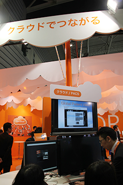 ケアストリームヘルスは,テーマとして「クラウドでつながる」を掲げて展示を行ったが,ブースデザインもコーポレートカラーのオレンジをベースに,白い雲(クラウド)を大胆に配したものとなっていた。同社は,データセンターを利用したサービスを2010年から展開しており,クラウドサービスでは豊富な経験と実績を持つ。展示では,「Vue クラウド」として“バックアップ”,“公開サーバアクセス”,“データ共有”,“遠隔読影”,“遠隔検査予約”,“シンプル&低コスト”のクラウドサービス「DIAS(ディアス) クラウド」など,ユーザーの環境に合わせたサービスの提供が可能なことをアピールした。