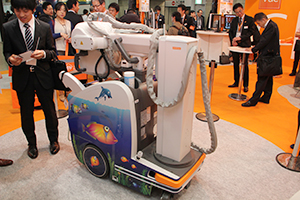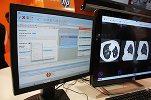 DRソリューションでは,2013年1月に日本で発売され大きな注目を集めた移動型X線診断装置「DRX-Revolution Mobile X-Ray システム」を中心に展示。本体の19インチと管球側の8インチの2つのカラーモニタを搭載し,駆動サポートモーターによる取り回しの容易さなどを実機のデモンストレーションでPRした。DRX-Revolutionの最新バージョンでは,画像処理によって胸部の骨除去を行う“ボーンサプレッション”が搭載される。また,ワイヤレスFPDの「DRX-1」には,四切サイズが追加されたほか,ワイヤードタイプの「TDR」を参考展示した。