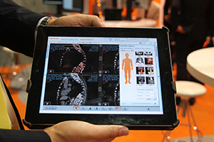 PACSソリューションでは,読影向け高機能ビューワである「Power Viewer」,参照用モバイルビューワの「Vue Motion」を展示。Power Viewerでは,最新バージョンで搭載される内蔵型レポート(Native Report)が特長で,PACSとの一体化によってレポートのハイパーリンクから該当症例の病変へのジャンプなど密接な連携が可能になっている。また,モバイル端末でのビューワであるVue Motionでは,iPad以外にiPhoneやAndroidへの対応(FDA取得),4分割(2×2)表示などの機能を紹介した。