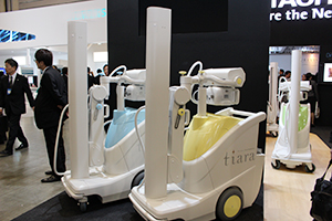 移動型X線装置「Sirius Starmobile tiara」は,現場の声をもとに開発された装置で,小回りの利くスリムボディ,独自のパンタグラフアームによる簡単なポジショニング,ワイヤレスFPD搭載による撮影後の迅速な画像確認などが特長。ワイヤレスFPDは3サイズを用意している。tiaraは5色のカラーバリエーションと小児向けのアニマルデザインの6種が紹介され,来場者は軽快な操作性を体感していた。