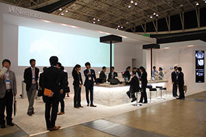 環境への配慮をコンセプトに清潔さをイメージしたブースの根本杏林堂では,各種造影剤注入装置を中心に展示が行われた。また,ブースの壁面には,製品のコンセプトと同社が造影というものをどう考えるかについて,キーワードを使って紹介する映像が投影された。