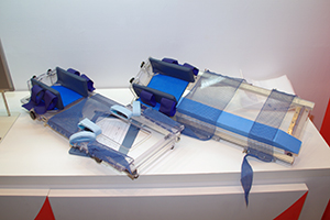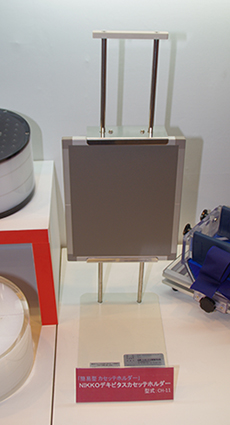 今回初めてITEMに出品したNIKKOデキビタスカセッテホルダーはX線用ブッキーテーブルの上に置いて側面の撮影をする際に使用する。上からの臥位X線撮影時に,同一部位を横から撮りたい場合に使用する。