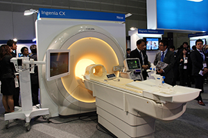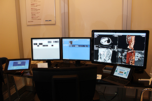 4月7日に発売されたばかりの「Ingenia CX」は,SNRを向上させるフルデジタルテクノロジー“dStream”と,最大傾斜磁場強度80mT/m(3T)/66mT/m(1.5T)のグラディエントコイルを搭載した最上位機種。ルーチン検査の画質向上を可能にする高速化,高画質化,動き補正のアプリケーションのバージョンアップも図られており,高機能アプリケーションも含め臨床画像とともに展示された。