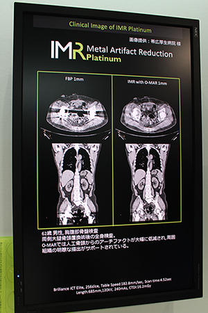 CTのコーナーでは,昨年のITEM2013で発表されたモデルベースの逐次近似再構成技術“IMR”がバージョンアップした“IMR Platinum”が紹介された。新たに開発された超高速画像再構成コンピュータユニット「HyperSight IMR」をにより,どの部位でも3分以内の画像再構成が可能になっている。また,金属アーチファクト抑制技術“O-MAR”との併用が可能になり,さらなる画質向上を実現している。